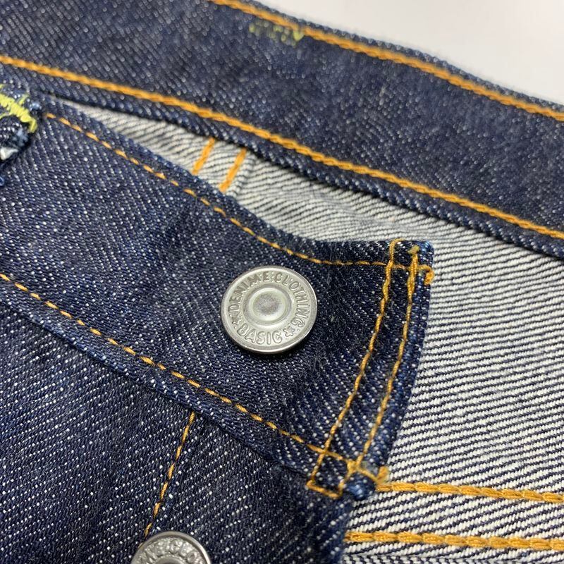 ・ディテール:ボタンフライ、綿糸縫製、 鉄製タックボタン、レッドピスネーム