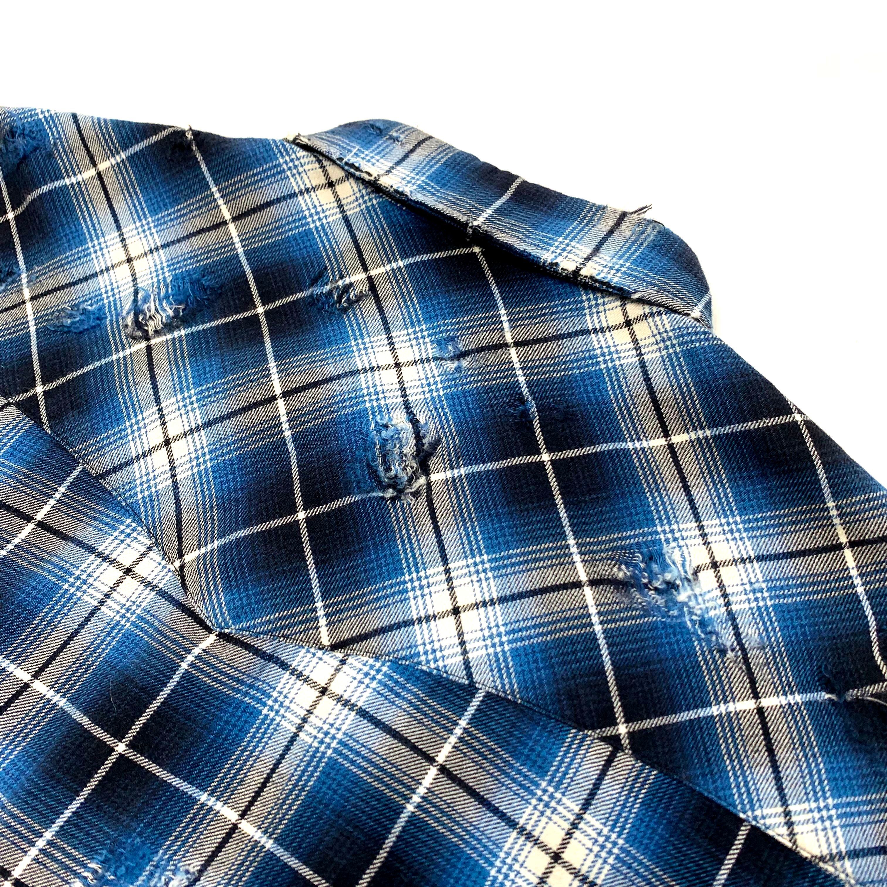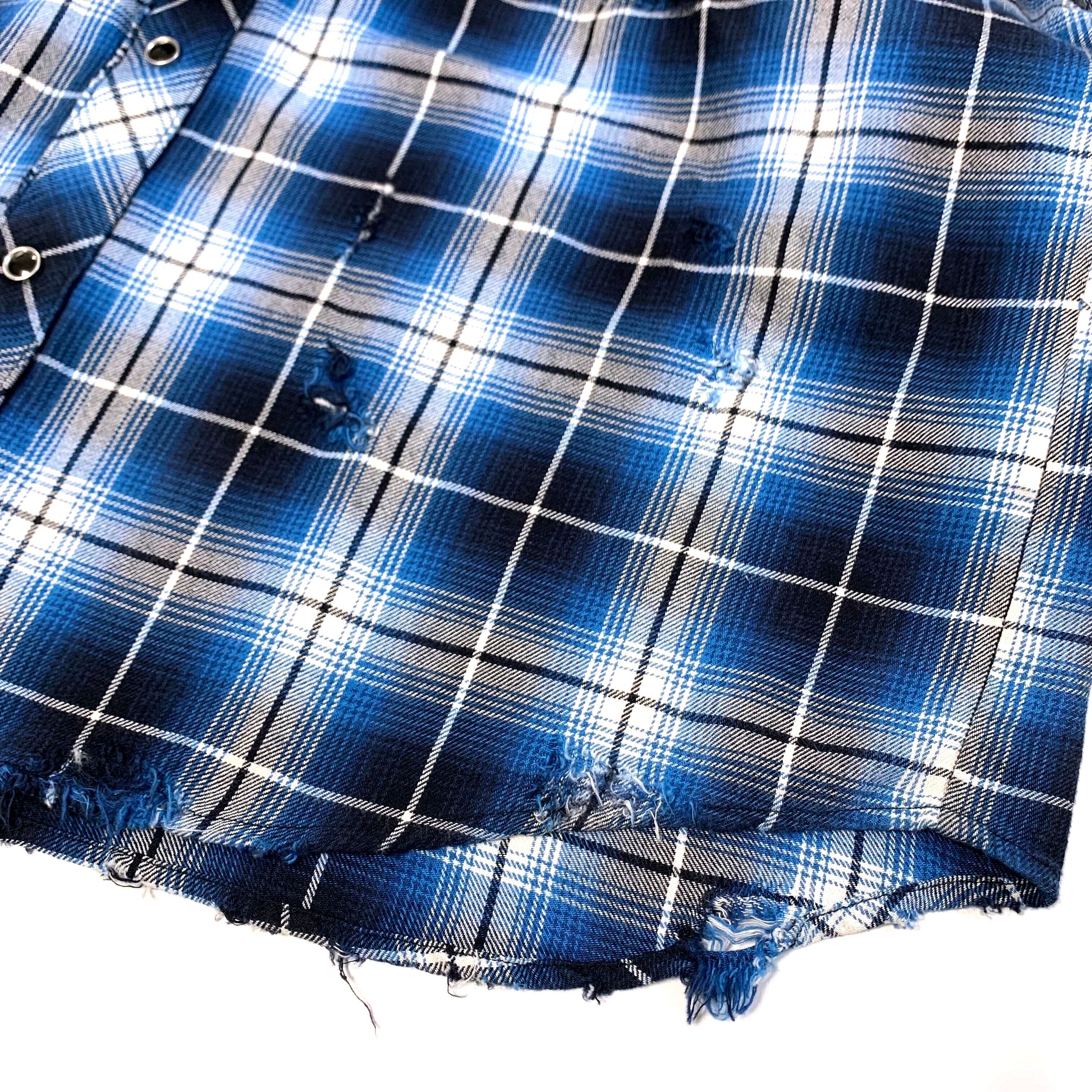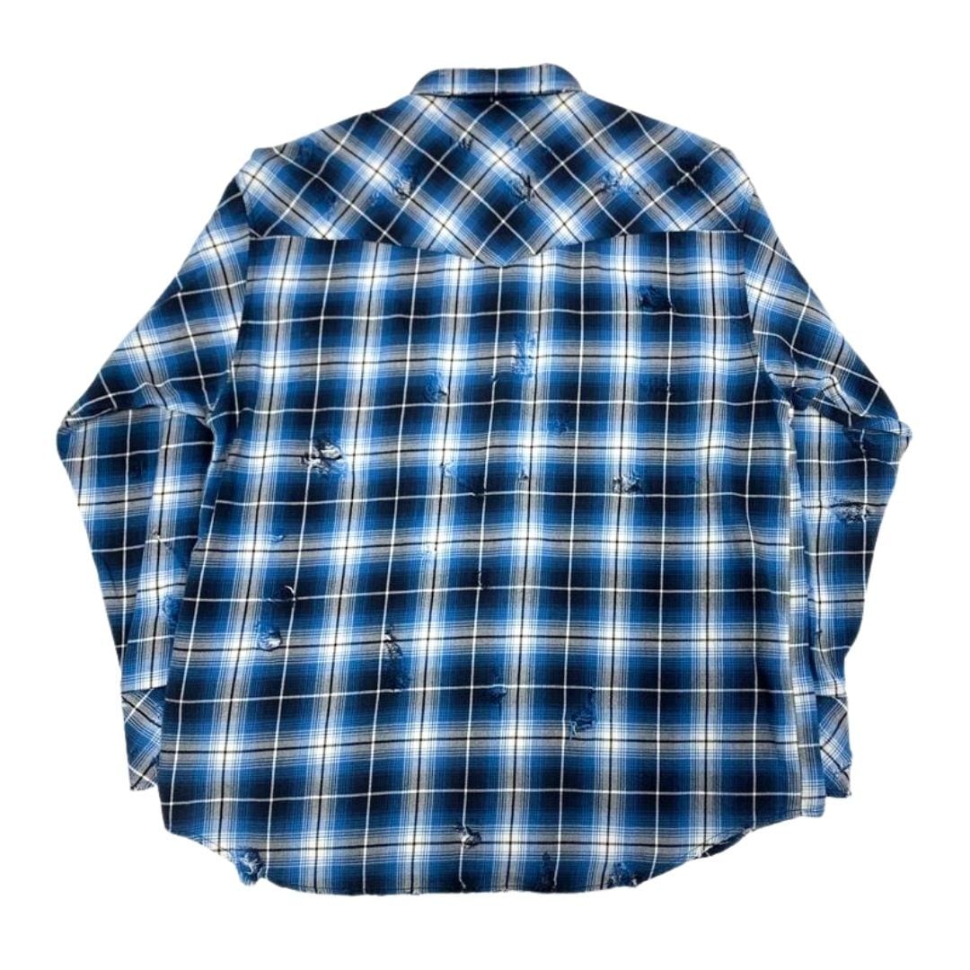 【美品】Rafu ラフ Western shirt ダメージ加工 レギュラーカラー ウエスタンシャツ オンブレチェック 長袖 シャツ ブルー L/The Soloist