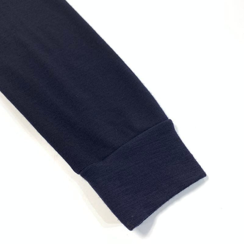 Super 120's(17.5マイクロン)というスーパーエクストラファインメリノと言われる超極細繊維の素材をジャージー生地用に超極細番手に梳いた梳毛糸を使用して編み上げたとても豪華なウールインナーカットソー。